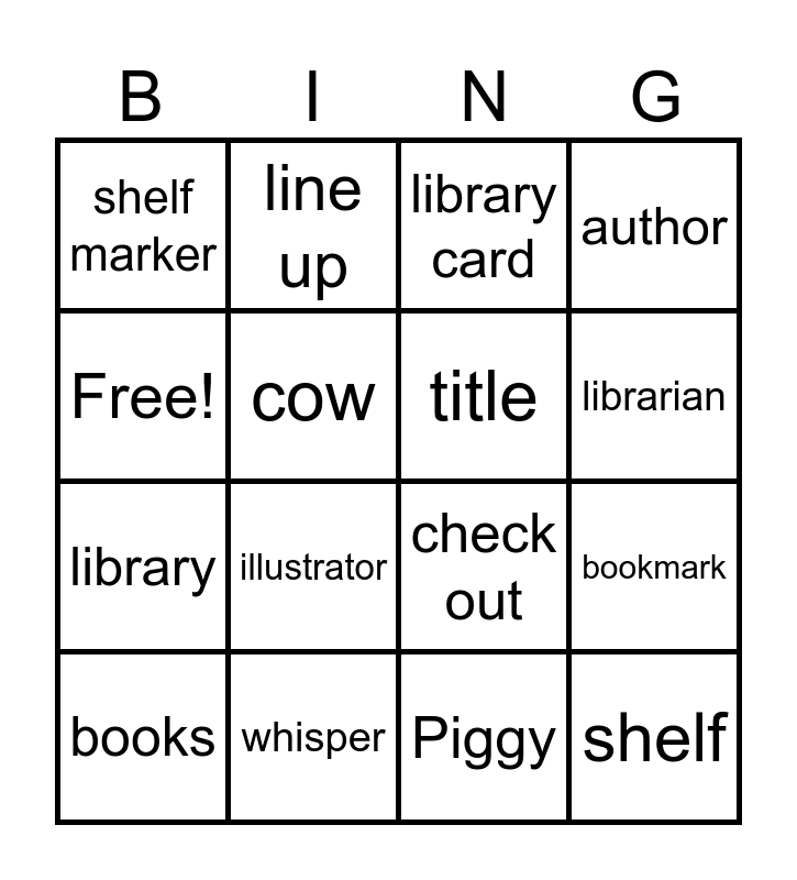 This bingo card has 16 words: whisper, bookmark, library card, shelf marker, library, line up, check out, Piggy, Free!, cow, books, author, illustrator, librarian, title and shelf.