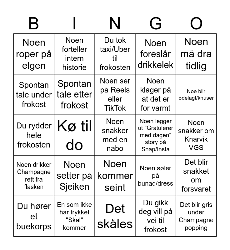 This bingo card has 25 words: Noen setter på Sjeiken, Det skåles, Noen ser på Reels eller TikTok, Du hører et buekorps, Noen må dra tidlig, Noen roper på elgen, Spontan tale under frokost, Noen forteller intern historie, Noen legger ut "Gratulerer med dagen" story på Snap/Insta, Noen kommer seint, Noen klager på at det er for varmt, Du rydder hele frokosten, Noen søler på bunad/dress, Det blir snakket om forsvaret, Spontan tale etter frokost, Det blir gris under Champagne popping, Noen snakker om Knarvik VGS, Du tok taxi/Uber til frokosten, Noe blir ødelagt/knuser, Kø til do, Noen snakker med en nabo, En som ikke har trykket "Skal" kommer, Noen drikker Champagne rett fra flasken, Noen foreslår drikkelek and Du gikk deg vill på vei til frokost.