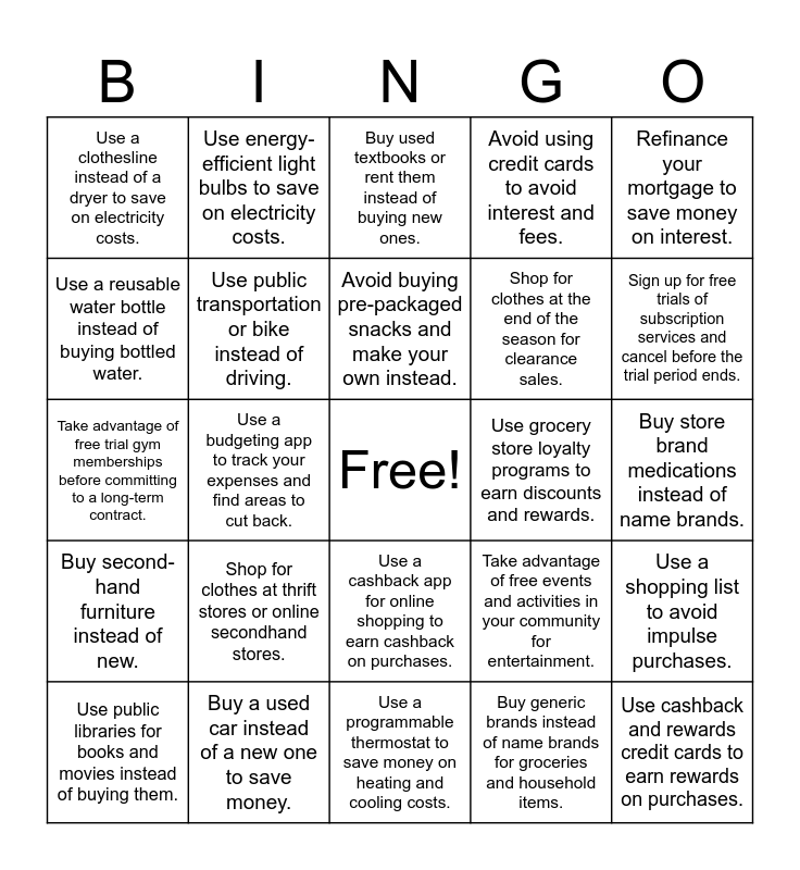 This bingo card has a free space and 50 words: Shop at discount grocery stores for groceries., Use cashback and rewards credit cards to earn rewards on purchases., Make your own coffee at home instead of buying it from a coffee shop., Use a programmable thermostat to save money on heating and cooling costs., Shop for clothes at thrift stores or online secondhand stores., Cook meals in bulk and freeze leftovers for future meals., Use energy-efficient light bulbs to save on electricity costs., Turn off lights and unplug electronics when not in use., Use a reusable water bottle instead of buying bottled water., Shop around for car insurance to find the best rates., Use public transportation or bike instead of driving., Avoid using credit cards to avoid interest and fees., Use a shopping list to avoid impulse purchases., Take advantage of free events and activities in your community for entertainment., Cut cable TV and stream shows and movies online instead., Make your own cleaning supplies instead of buying them., Avoid buying pre-packaged snacks and make your own instead., Use grocery store loyalty programs to earn discounts and rewards., Buy non-perishable items in bulk to save money., Refinance your mortgage to save money on interest., Use a budgeting app to track your expenses and find areas to cut back., Buy generic brands instead of name brands for groceries and household items., Use a clothesline instead of a dryer to save on electricity costs., Shop for clothes at the end of the season for clearance sales., Use a rewards program for gas purchases to earn discounts or free gas., Take advantage of student discounts if you’re a student., Sign up for free trials of subscription services and cancel before the trial period ends., Use a reusable shopping bag instead of buying plastic bags at the store., Buy used textbooks or rent them instead of buying new ones., Use a cashback app for online shopping to earn cashback on purchases., Avoid buying bottled drinks and make your own at home., Make your own laundry detergent instead of buying it., Buy in-season produce to save money on groceries., Cut your own hair instead of going to a salon., Buy a used car instead of a new one to save money., Use a low-flow showerhead to save on water costs., Shop for holiday decorations after the holiday for clearance sales., Use a bicycle trailer to carry groceries and other items instead of driving., Shop for produce at local farmer markets to save money., Buy store brand medications instead of name brands., Use a smart power strip to save energy and reduce electricity costs., Use a rain barrel to collect rainwater for watering plants and lawns., Cut back on eating out and cook meals at home., Bring your lunch to work instead of eating out., Use public libraries for books and movies instead of buying them., Take advantage of free trial gym memberships before committing to a long-term contract., Use a pressure cooker to cook meals quickly and efficiently., Use a water filter instead of buying bottled water., Buy second-hand furniture instead of new. and Use a slow cooker to make meals that will last for multiple days..