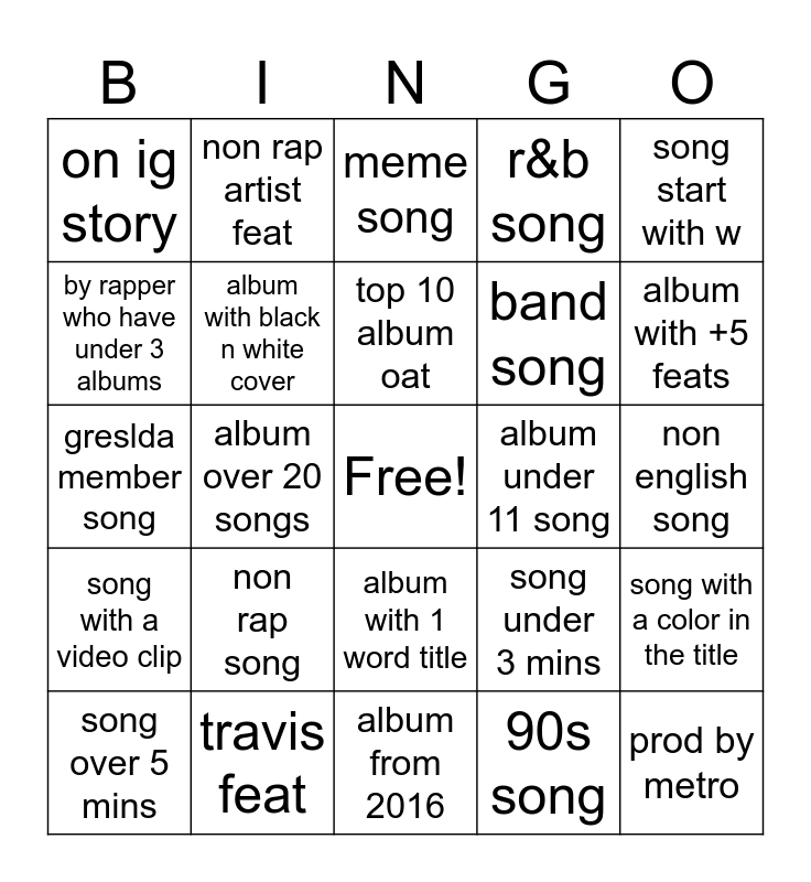 This bingo card has a free space and 24 words: non rap song, travis feat, top 10 album oat, song over 5 mins, song start with w, on ig story, by rapper who have under 3 albums, non rap artist feat, album under 11 song, album with 1 word title, band song, greslda member song, song under 3 mins, song with a color in the title, album with black n white cover, 90s song, non english song, meme song, album with +5 feats, album over 20 songs, prod by metro, song with a video clip, r&b song and album from 2016.