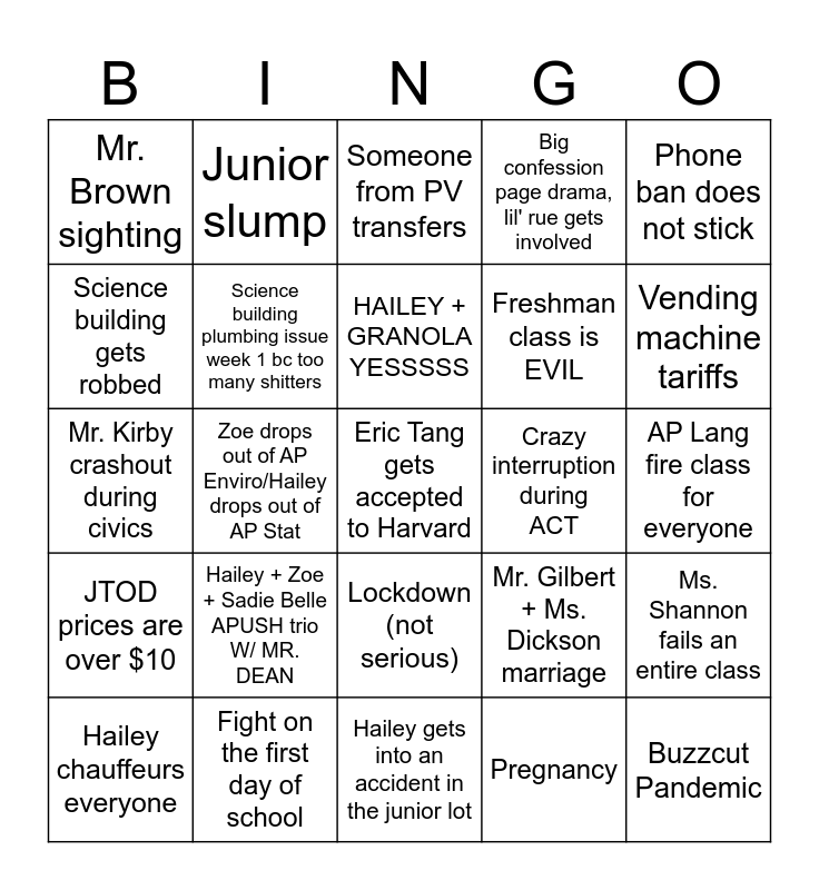 This bingo card has a free space and 24 words: Hailey + Zoe + Sadie Belle APUSH trio W/ MR. DEAN, Fight on the first day of school, HAILEY + GRANOLA YESSSSS, Hailey chauffeurs everyone, Phone ban does not stick, Mr. Brown sighting, Science building gets robbed, Junior slump, Crazy interruption during ACT, Lockdown (not serious), Freshman class is EVIL, Mr. Kirby crashout during civics, Mr. Gilbert + Ms. Dickson marriage, Ms. Shannon fails an entire class, Science building plumbing issue week 1 bc too many shitters, Pregnancy, AP Lang fire class for everyone, Someone from PV transfers, Vending machine tariffs, Zoe drops out of AP Enviro/Hailey drops out of AP Stat, Buzzcut Pandemic, JTOD prices are over $10, Big confession page drama, lil' rue gets involved and Hailey gets into an accident in the junior lot.