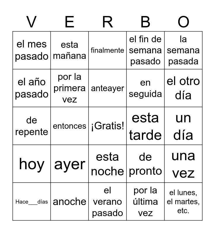 This bingo card has a free space and 24 words: ayer, anoche, anteayer, Hace___días, la semana pasada, el mes pasado, el año pasado, esta mañana, esta tarde, esta noche, en seguida, de repente, de pronto, una vez, por la primera vez, por la última vez, un día, finalmente, el otro día, entonces, el lunes, el martes, etc., hoy, el fin de semana pasado and el verano pasado.