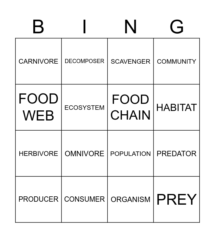 This bingo card has 16 words: CONSUMER, PREDATOR, SCAVENGER, CARNIVORE, HERBIVORE, DECOMPOSER, POPULATION, ORGANISM, FOOD WEB, ECOSYSTEM, PRODUCER, COMMUNITY, OMNIVORE, HABITAT, FOOD CHAIN and PREY.