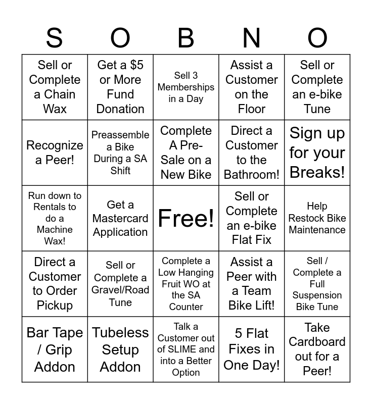 This bingo card has a free space and 24 words: Sell or Complete a Gravel/Road Tune, Tubeless Setup Addon, Complete A Pre-Sale on a New Bike, Bar Tape / Grip Addon, Sell or Complete an e-bike Tune, Sell or Complete a Chain Wax, Recognize a Peer!, Get a $5 or More Fund Donation, Sell or Complete an e-bike Flat Fix, Complete a Low Hanging Fruit WO at the SA Counter, Direct a Customer to the Bathroom!, Run down to Rentals to do a Machine Wax!, Assist a Peer with a Team Bike Lift!, Sell / Complete a Full Suspension Bike Tune, Preassemble a Bike During a SA Shift, 5 Flat Fixes in One Day!, Help Restock Bike Maintenance, Sell 3 Memberships in a Day, Sign up for your Breaks!, Get a Mastercard Application, Take Cardboard out for a Peer!, Direct a Customer to Order Pickup, Assist a Customer on the Floor and Talk a Customer out of SLIME and into a Better Option.