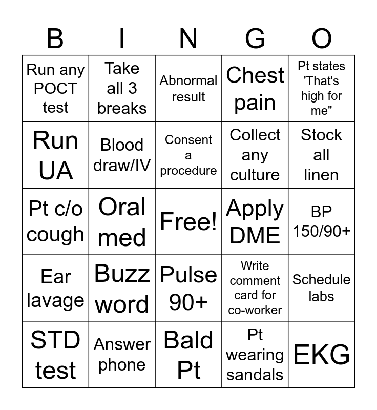 This bingo card has a free space and 29 words: STD test, Any rectal problems, Oral med, Pt C/O mental health problems, Run any POCT test, Abnormal result, Blood draw/IV, Buzz word, Apply DME, Answer phone, BP 150/90+, EKG, Bald Pt, Pt wearing sandals, Stock all linen, Pt has "Sinus infection", Pulse 90+, Ear lavage, Pt states 'That's high for me", Pt c/o cough, Write comment card for co-worker, 2-fer or more, Collect any culture, Run UA, Chest pain, Take all 3 breaks, Schedule labs, Consent a procedure and SOB.