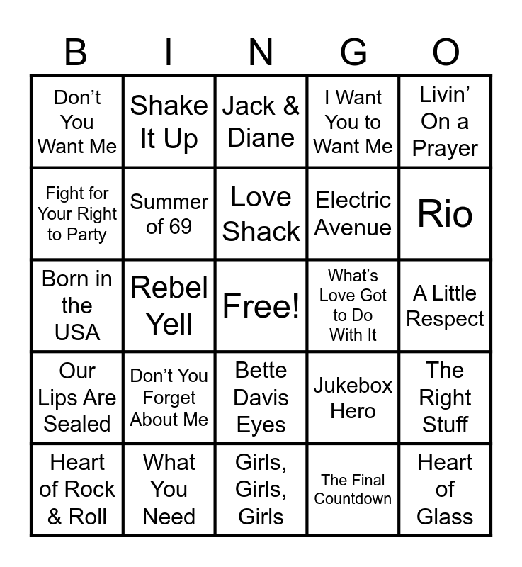 This bingo card has a free space and 75 words: I Love Rock & Roll, Eye of the Tiger, Jack & Diane, Tainted Love, 867-5309, We Got the Beat, Pop Music, Another One Bites the Dust, I Ran, Whip It, Back in Black, Take On Me, Love Shack, Fight for Your Right to Party, Life in a Big Country, Rebel Yell, Uptown Girl, Heart of Glass, Old Time Rock & Roll, Livin’ On a Prayer, Total Eclipse of the Heart, Born in the USA, Summer of 69, Shake It Up, I Want You to Want Me, Girls Just Wanna Have Fun, Sunglasses at Night, Just Like Heaven, Modern Love, You Spin Me Round, Let’s Hear It For the Boy, Lookin’ For Love, Come On Eileen, Jukebox Hero, Rio, Electric Avenue, Sailing, I Love a Rainy Night, A Little Respect, The Final Countdown, Sweet Dreams are Made of These, Epic, She Drives Me Crazy, Relax, Keep Your Hands to Yourself, Sweet Child O’ Mine, Heart of Rock & Roll, Don’t You Want Me, Don’t Stop Believing, Danger Zone, Footloose, Bette Davis Eyes, Holiday Road, Material Girl, Beat It, Hit Me With Your Best Shot, Down Under, Wake Me Up Before You Go Go, Mickey, American Girl, Don’t You Forget About Me, Roxanne, Everyone Wants to Rule the World, Sledgehammer, I Melt With You, What’s Love Got to Do With It, Working for the Weekend, I Just Called to Say I Love You, 99 Red Balloons, The Right Stuff, Our Lips Are Sealed, What You Need, Blue Monday, Girls, Girls, Girls and I Wanna Rock.