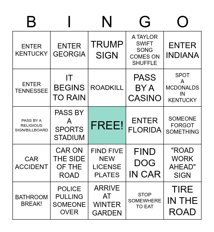 This bingo card has a free space and 24 words: CAR ON THE SIDE OF THE ROAD, POLICE PULLING SOMEONE OVER, ROADKILL, BATHROOM BREAK!, ENTER INDIANA, ENTER KENTUCKY, ENTER TENNESSEE, ENTER GEORGIA, ENTER FLORIDA, FIND FIVE NEW LICENSE PLATES, PASS BY A CASINO, PASS BY A RELIGIOUS SIGN/BILLBOARD, FIND DOG IN CAR, "ROAD WORK AHEAD" SIGN, IT BEGINS TO RAIN, STOP SOMEWHERE TO EAT, SOMEONE FORGOT SOMETHING, TRUMP SIGN, SPOT A MCDONALDS IN KENTUCKY, PASS BY A SPORTS STADIUM, TIRE IN THE ROAD, CAR ACCIDENT, A TAYLOR SWIFT SONG COMES ON SHUFFLE and ARRIVE AT WINTER GARDEN.