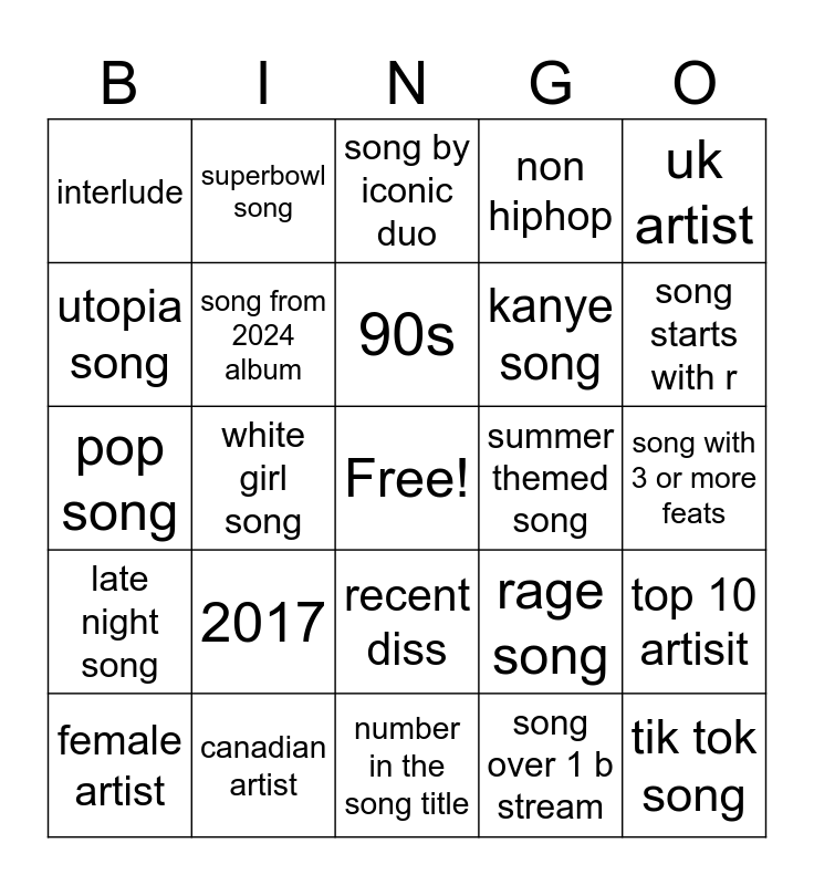 This bingo card has a free space and 24 words: 2017, canadian artist, 90s, female artist, uk artist, interlude, utopia song, superbowl song, summer themed song, recent diss, kanye song, pop song, rage song, top 10 artisit, song from 2024 album, song over 1 b stream, song with 3 or more feats, song by iconic duo, song starts with r, white girl song, tik tok song, late night song, non hiphop and number in the song title.