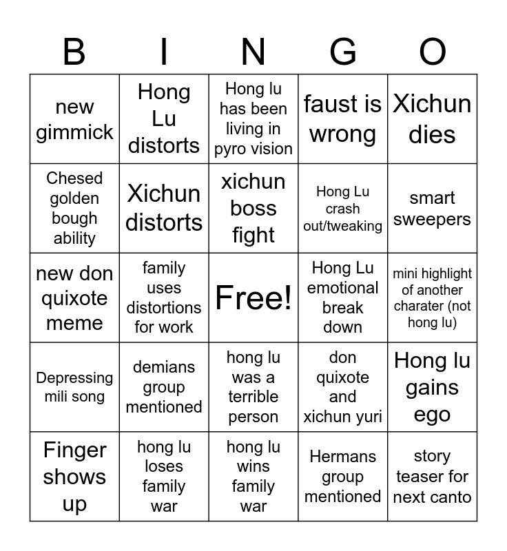 This bingo card has a free space and 24 words: demians group mentioned, hong lu loses family war, xichun boss fight, Finger shows up, Xichun dies, new gimmick, Chesed golden bough ability, Hong Lu distorts, Hong Lu emotional break down, hong lu was a terrible person, Hong Lu crash out/tweaking, new don quixote meme, don quixote and xichun yuri, Hong lu gains ego, Xichun distorts, Hermans group mentioned, mini highlight of another charater (not hong lu), Hong lu has been living in pyro vision, smart sweepers, family uses distortions for work, story teaser for next canto, Depressing mili song, faust is wrong and hong lu wins family war.