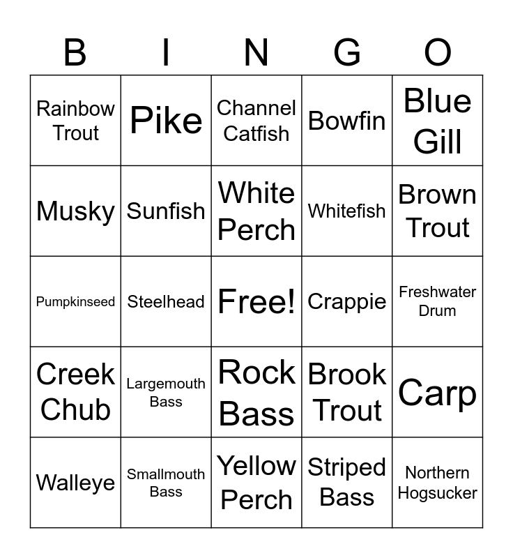 This bingo card has a free space and 24 words: Largemouth Bass, Smallmouth Bass, White Perch, Walleye, Blue Gill, Rainbow Trout, Musky, Pike, Crappie, Rock Bass, Whitefish, Pumpkinseed, Brook Trout, Carp, Sunfish, Striped Bass, Freshwater Drum, Channel Catfish, Brown Trout, Steelhead, Northern Hogsucker, Creek Chub, Bowfin and Yellow Perch.
