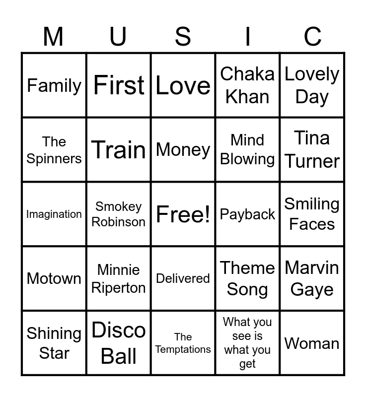 This bingo card has a free space and 24 words: Minnie Riperton, Disco Ball, Money, Shining Star, Lovely Day, Family, The Spinners, First, Payback, Delivered, Mind Blowing, Imagination, Theme Song, Marvin Gaye, Train, What you see is what you get, Smiling Faces, Love, Tina Turner, Smokey Robinson, Woman, Motown, Chaka Khan and The Temptations.