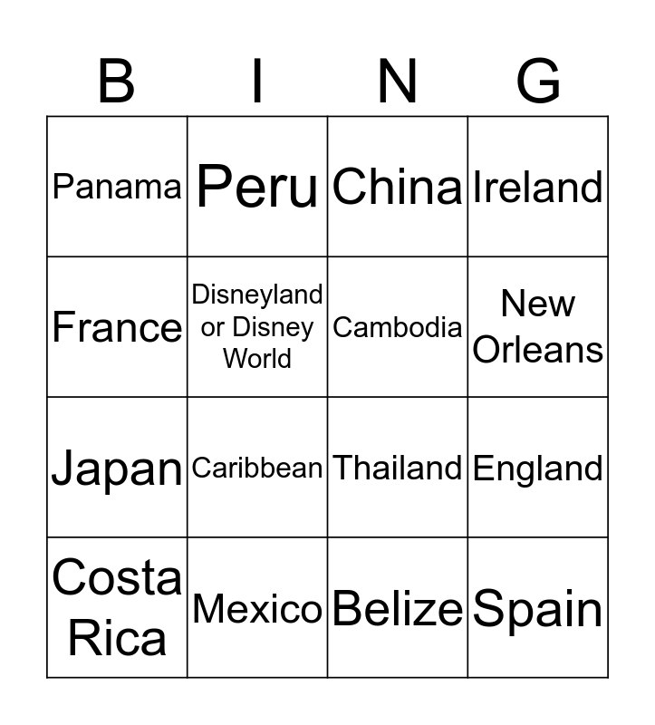 This bingo card has 40 words: Thailand, Thailand, India, Cambodia, New Mexico, New York, New Orleans, Guatemala, France, Spain, England, Ireland, Costa Rica, Belize, Mexico, Colombia, Greece, Panama, Las Vegas, China, Grand Canyon, New Zealand, Japan, Disneyland or Disney World, Bali, Brazil, Eastern Europe, Netherlands, Scotland, Germany, Texas, Mount Rushmore, Yellowstone, San Diego, Caribbean, Visit 1 of the 7 Wonders of the World, Yosemite, Armstrong Woods, Peru and Colorado.