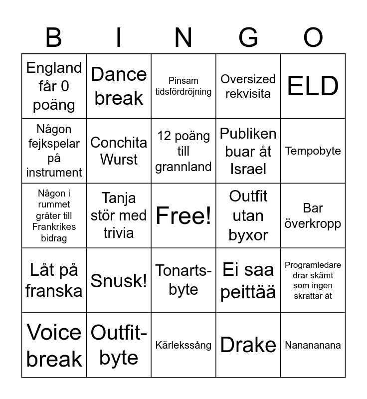 This bingo card has a free space and 24 words: Snusk!, Outfit-byte, 12 poäng till grannland, Voice break, ELD, England får 0 poäng, Någon fejkspelar på instrument, Dance break, Outfit utan byxor, Tonarts-byte, Publiken buar åt Israel, Någon i rummet gråter till Frankrikes bidrag, Ei saa peittää, Programledare drar skämt som ingen skrattar åt, Conchita Wurst, Drake, Bar överkropp, Pinsam tidsfördröjning, Tempobyte, Tanja stör med trivia, Nanananana, Låt på franska, Oversized rekvisita and Kärlekssång.