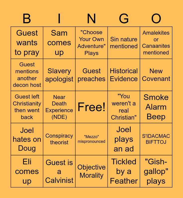 This bingo card has a free space and 28 words: S'IDACMAC BIFTTOJ, TAG, Historical Evidence, Tickled by a Feather, Guest mentions another decon host, "Choose Your Own Adventure" Plays, Sam comes up, Joel hates on Doug, "You weren't a real Christian", Eli comes up, Guest left Christianity then went back, Sin nature mentioned, Guest is a Calvinist, Objective Morality, New Covenant, Joel eats something, Conspiracy theorist, Slavery apologist, Guest preaches, "Mezzo" mispronounced, Guest wants to pray, Personal testimony, "Gish-gallop" plays, Near Death Experience (NDE), Smoke Alarm Beep, Joel plays an ad, Amalekites or Canaanites mentioned and Dumpling emojis mentioned.