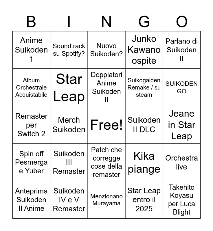 This bingo card has a free space and 24 words: Suikoden III Remaster, Suikoden IV e V Remaster, Doppiatori Anime Suikoden II, Anteprima Suikoden II Anime, Parlano di Suikoden II, Anime Suikoden 1, Album Orchestrale Acquistabile, Soundtrack su Spotify?, Suikoden II DLC, Patch che corregge cose della remaster, Suikogaiden Remake / su steam, Remaster per Switch 2, Kika piange, Orchestra live, Star Leap, Star Leap entro il 2025, Jeane in Star Leap, Nuovo Suikoden?, SUIKODEN GO, Merch Suikoden, Takehito Koyasu per Luca Blight, Spin off Pesmerga e Yuber, Junko Kawano ospite and Menzionano Murayama.