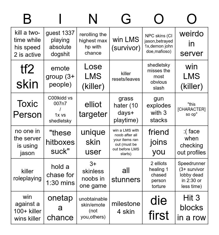 This bingo card has 36 words: all stunners, 3+ skinless noobs in one game, milestone 4 skin, tf2 skin, no one in the server is using jason, grass hater (10 days+ playtime), emote group (3+ people), unobtainable skin/emote (not you,others), NPC skins (CI jason,betrayed 1x,demon john doe,mafioso), 2 elliots healing 1 chased person torture, win LMS (killer), win LMS (survivor), Speedrunner (3+ survivor lobby dead in 2:30 or less time), C00lkidd vs 007n7 / 1x vs shedletsky, killer resets/leaves, kill a two-time while his speed 2 is active, killer roleplaying, gun explodes with 3 stacks, Toxic Person, rerolling the highest max hp with chance, elliot targeter, "these hitboxes suck", win a LMS with noob after all your items ran out (must be out before LMS starts), unique skin user, friend joins you, guest 1337 playing absolute dogshit, shedletsky misses the most obvious slash, onetap a chance, Lose LMS (killer), weirdo in server, Hit 3 blocks in a row, win against a 100+ killer wins killer, :( face when checking out profiles, "this [CHARACTER] so op", hold a chase for 1:30 mins and die first.