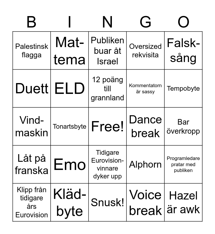 This bingo card has a free space and 24 words: Emo, Kläd-byte, 12 poäng till grannland, Klipp från tidigare års Eurovision, Falsk- sång, Palestinsk flagga, Duett, Mat-tema, Dance break, Tidigare Eurovision-vinnare dyker upp, Kommentatorn är sassy, Vind-maskin, Alphorn, Programledare pratar med publiken, ELD, Voice break, Bar överkropp, Publiken buar åt Israel, Tempobyte, Tonartsbyte, Hazel är awk, Låt på franska, Oversized rekvisita and Snusk!.