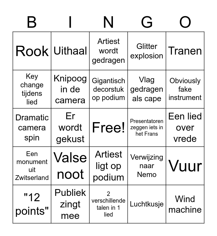 This bingo card has a free space and 31 words: 2 verschillende talen in 1 lied, Belgische vlag, Er wordt gekust, Awkward silence, Rook, Artiest wordt gedragen, Knipoog in de camera, Verwijzing naar Nemo, Presentatoren zeggen iets in het Frans, Luchtkusje, Een lied over vrede, Wind machine, Peter Van De Veire maakt een woordmopje, Presentator outfit-wissel, Obviously fake instrument, "Thank you, Europe!", Vuur, Valse noot, Een monument uit Zwitserland, Artiest ligt op podium, Tranen, Zwoele blik in de camera, "12 points", Uithaal, Vlag gedragen als cape, Key change tijdens lied, Glitter explosion, Dramatic camera spin, Publiek zingt mee, Gigantisch decorstuk op podium and Awkward green room moment.