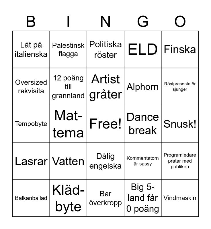 This bingo card has a free space and 24 words: Vatten, Kläd-byte, Artist gråter, Balkanballad, Finska, Låt på italienska, Oversized rekvisita, Palestinsk flagga, Dance break, Dålig engelska, Alphorn, Tempobyte, Kommentatorn är sassy, Programledare pratar med publiken, 12 poäng till grannland, Big 5-land får 0 poäng, Snusk!, Politiska röster, Röstpresentatör sjunger, Mat-tema, Vindmaskin, Lasrar, ELD and Bar överkropp.