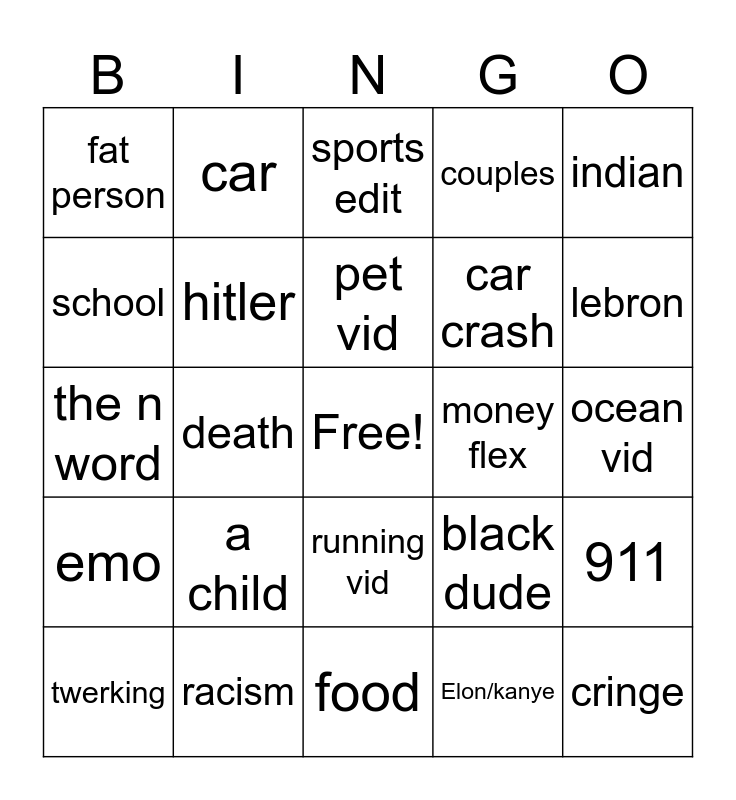 This bingo card has a free space and 24 words: a child, racism, pet vid, twerking, indian, fat person, school, car, money flex, running vid, car crash, the n word, black dude, 911, hitler, Elon/kanye, ocean vid, sports edit, lebron, death, cringe, emo, couples and food.