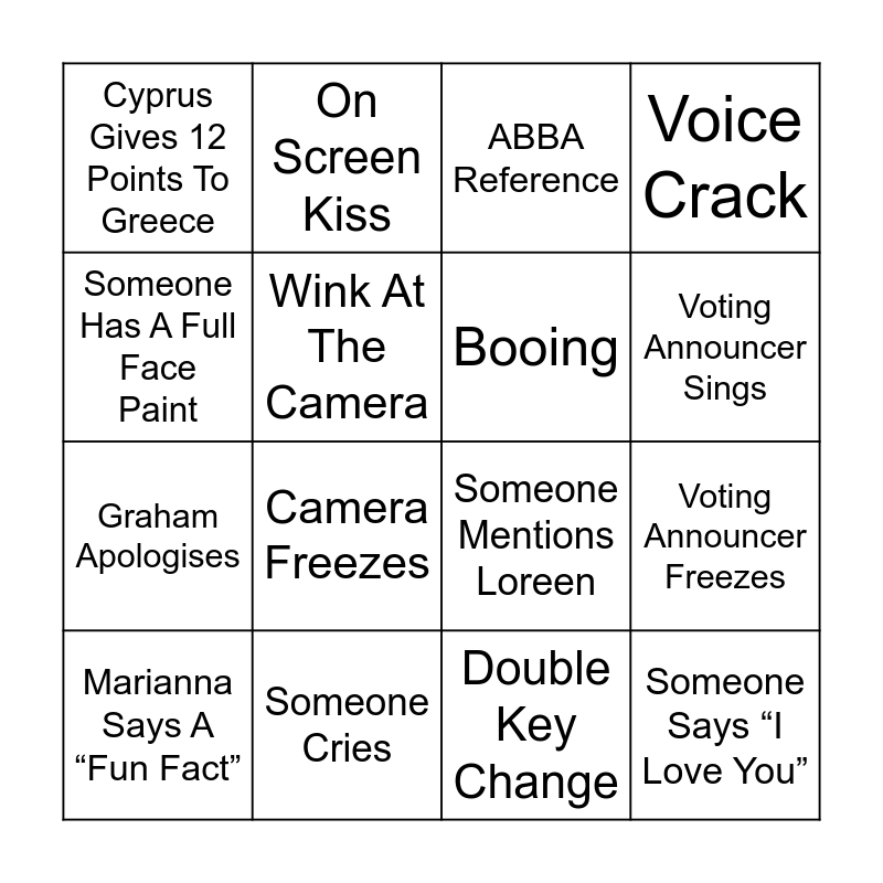 This bingo card has 25 words: Free!, Double Costume Change, Voting Announcer Sings, “I’m Sorry, Zero Points”, Someone Has A Full Face Paint, Cyprus Gives 12 Points To Greece, Wink At The Camera, On Screen Kiss, Someone Cries, Wardrobe Malfunction, Graham Apologises, Someone Mentions Loreen, Someone Falls, Matt Says A “Fun Fact”, Booing, Graham Corrects Himself, Double Key Change, ABBA Reference, Camera Freezes, Voting Announcer Freezes, Marianna Says A “Fun Fact”, Someone Mentions Peace Or War, Someone Says “I Love You”, Voice Crack and Someone Mentions Brexit.