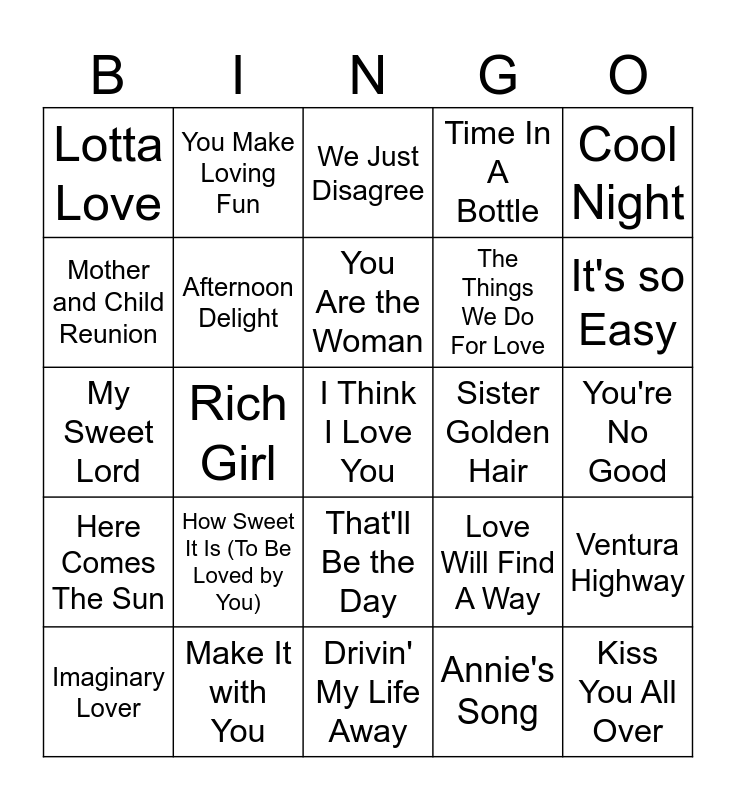 This bingo card has 61 words: Free!, Make It with You, Silly Love Songs, Here Comes The Sun, Annie's Song, Just You 'N' Me, Afternoon Delight, Me and You and a Dog Named Boo, The Things We Do For Love, Do You Believe in Magic?, Time In A Bottle, Southern Cross, Mother and Child Reunion, Swayin' To The Music (Slow Dancin'), Southern Nights, Lotta Love, I Think I Love You, Cool Night, Just Remember I Love You, You Are the Woman, Sister Golden Hair, We Just Disagree, Imaginary Lover, Ventura Highway, Diamond Girl, I'll Be Around, She's Gone, Rock Me Gently, It's so Easy, Maybe I’m Amazed, You Can Do Magic, Handy Man, One Fine Day, Cracklin' Rosie, You Make Loving Fun, It Don't Come Easy, Philadelphia Freedom, Rich Girl, So Into You, My Sweet Lord, I Got You Babe, How Sweet It Is (To Be Loved by You), You're No Good, I Love a Rainy Night, Love Will Find A Way, Gypsys, Tramps & Thieves, 50 Ways to Leave Your Lover, Don't Go Breaking My Heart, Don't Pull Your Love, That'll Be the Day, Drivin' My Life Away, She's A Lady, Sunshine (Go Away Today), Da Doo Ron Ron, Turn Your Love Around, Time Passages, Fooled Around And Fell In Love, You're So Vain, Cat's in the Cradle, Kiss You All Over and Rocky Mountain High.