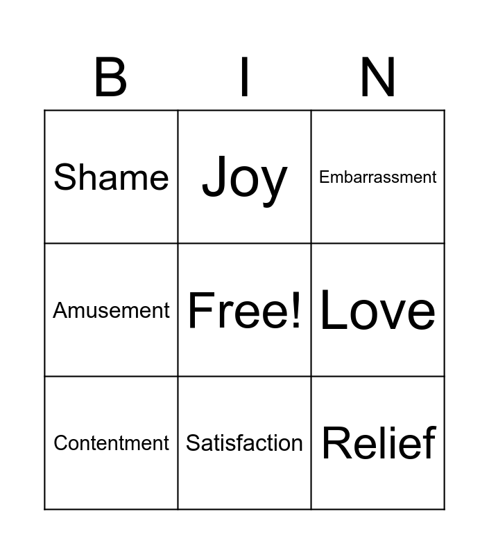 This bingo card has a free space and 50 words: happiness, Sadness, Fear, Anger, Disgust, Surprise, Joy, Gratitude, Love, Excitement, Contentment, Amusement, Awe, Pride, Hope, Serenity, Satisfaction, Affection, Enthusiasm, Relief, Anxiety, Guilt, Shame, Envy, Jealousy, Frustration, Loneliness, Despair, Embarrassment, Disappointment, Regret, Resentment, Contempt, Grief, Bitterness, Compassion, Empathy, Nostalgia, Admiration, Anticipation, Trust, Vulnerability, Indignation, Curiosity, Eagerness, Longing, Confusion, Suspicion, Insecurity and Empowerment.