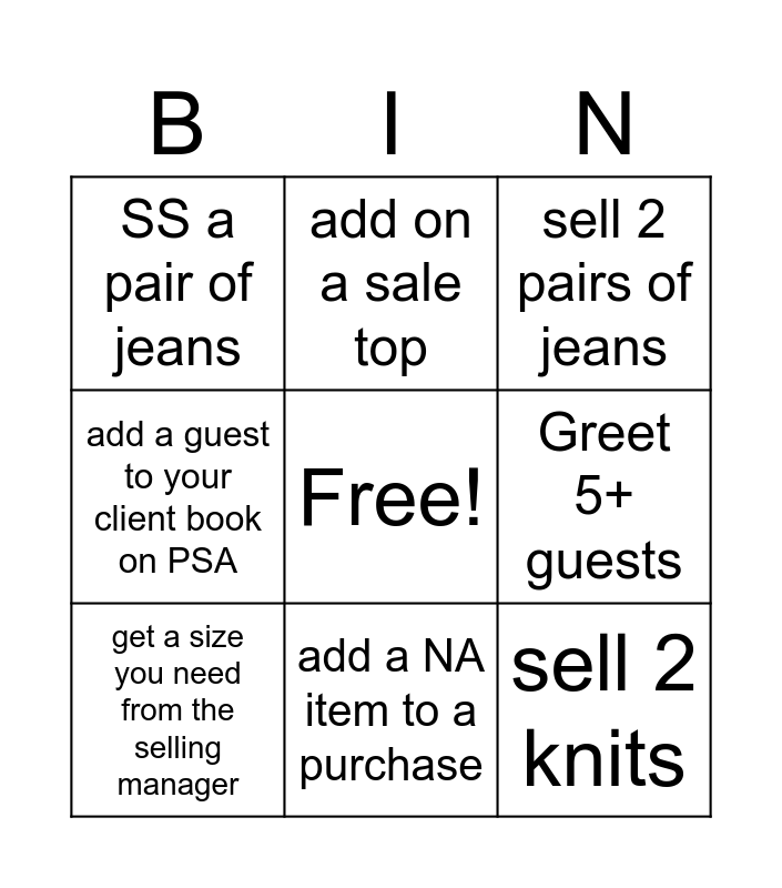 This bingo card has a free space and 8 words: Greet 5+ guests, sell 2 pairs of jeans, add on a sale top, get a size you need from the selling manager, SS a pair of jeans, sell 2 knits, add a guest to your client book on PSA and add a NA item to a purchase.