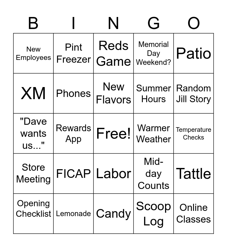 This bingo card has a free space and 24 words: FICAP, Lemonade, New Flavors, Opening Checklist, Patio, New Employees, XM, Pint Freezer, Warmer Weather, Labor, Summer Hours, "Dave wants us...", Mid-day Counts, Tattle, Phones, Scoop Log, Temperature Checks, Reds Game, Random Jill Story, Rewards App, Online Classes, Store Meeting, Memorial Day Weekend? and Candy.