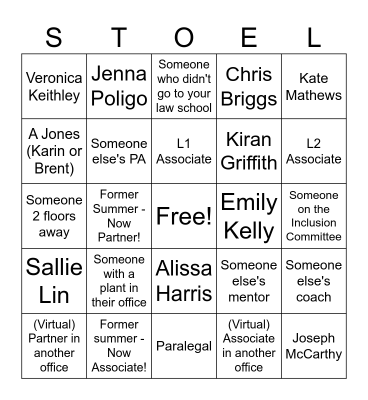 This bingo card has a free space and 24 words: Someone with a plant in their office, Former summer - Now Associate!, L1 Associate, (Virtual) Partner in another office, Kate Mathews, Veronica Keithley, A Jones (Karin or Brent), Jenna Poligo, Emily Kelly, Alissa Harris, Kiran Griffith, Someone 2 floors away, Someone else's mentor, Someone else's coach, Someone else's PA, (Virtual) Associate in another office, Someone on the Inclusion Committee, Someone who didn't go to your law school, L2 Associate, Former Summer - Now Partner!, Joseph McCarthy, Sallie Lin, Chris Briggs and Paralegal.