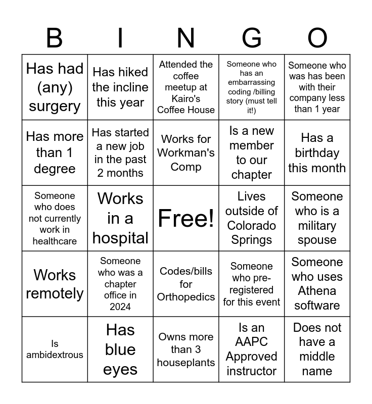 This bingo card has a free space and 24 words: Someone who was a chapter office in 2024, Has blue eyes, Works for Workman's Comp, Is ambidextrous, Someone who was has been with their company less than 1 year, Has had (any) surgery, Has more than 1 degree, Has hiked the incline this year, Lives outside of Colorado Springs, Codes/bills for Orthopedics, Is a new member to our chapter, Someone who does not currently work in healthcare, Someone who pre-registered for this event, Someone who uses Athena software, Has started a new job in the past 2 months, Is an AAPC Approved instructor, Someone who is a military spouse, Attended the coffee meetup at Kairo's Coffee House, Has a birthday this month, Works in a hospital, Does not have a middle name, Works remotely, Someone who has an embarrassing coding /billing story (must tell it!) and Owns more than 3 houseplants.