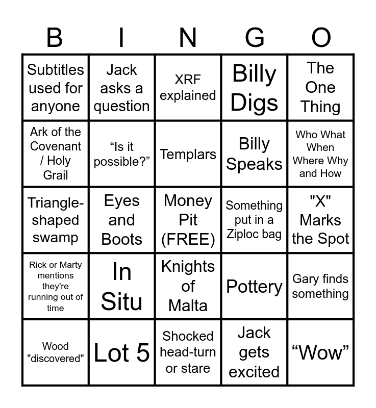 This bingo card has a free space and 24 words: In Situ, Lot 5, Templars, Wood "discovered", The One Thing, Subtitles used for anyone, Ark of the Covenant / Holy Grail, Jack asks a question, Something put in a Ziploc bag, Knights of Malta, Billy Speaks, Triangle-shaped swamp, Pottery, Gary finds something, “Is it possible?”, Jack gets excited, "X" Marks the Spot, XRF explained, Who What When Where Why and How, Eyes and Boots, “Wow”, Rick or Marty mentions they're running out of time, Billy Digs and Shocked head-turn or stare.