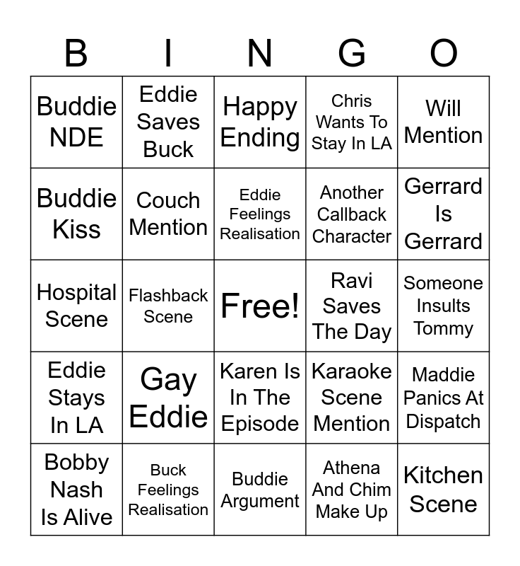 This bingo card has a free space and 24 words: Gay Eddie, Buck Feelings Realisation, Eddie Feelings Realisation, Bobby Nash Is Alive, Will Mention, Buddie NDE, Buddie Kiss, Eddie Saves Buck, Ravi Saves The Day, Karen Is In The Episode, Another Callback Character, Hospital Scene, Karaoke Scene Mention, Maddie Panics At Dispatch, Couch Mention, Athena And Chim Make Up, Someone Insults Tommy, Happy Ending, Gerrard Is Gerrard, Flashback Scene, Kitchen Scene, Eddie Stays In LA, Chris Wants To Stay In LA and Buddie Argument.