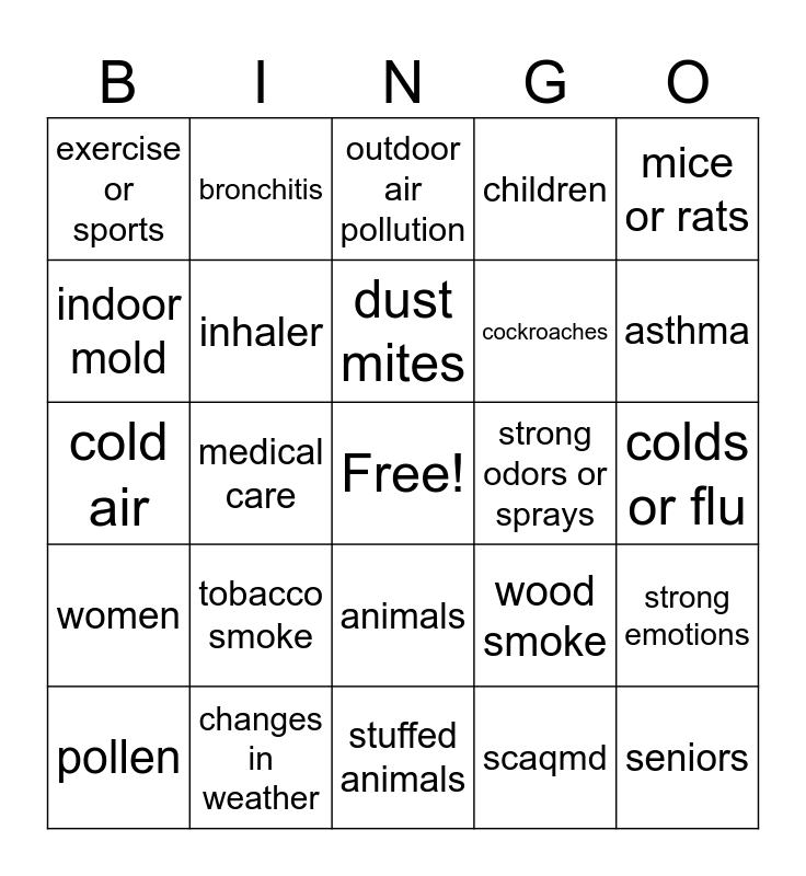 This bingo card has a free space and 24 words: tobacco smoke, changes in weather, dust mites, pollen, mice or rats, exercise or sports, indoor mold, bronchitis, strong odors or sprays, animals, cockroaches, cold air, wood smoke, strong emotions, inhaler, scaqmd, colds or flu, outdoor air pollution, asthma, medical care, seniors, women, children and stuffed animals.