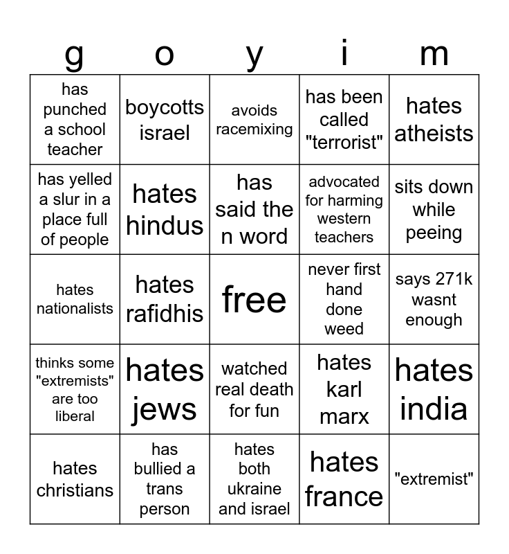 This bingo card has a free space and 24 words: hates jews, has bullied a trans person, has said the n word, hates christians, hates atheists, has punched a school teacher, has yelled a slur in a place full of people, boycotts israel, never first hand done weed, watched real death for fun, advocated for harming western teachers, hates nationalists, hates karl marx, hates india, hates hindus, hates france, says 271k wasnt enough, avoids racemixing, sits down while peeing, hates rafidhis, "extremist", thinks some "extremists" are too liberal, has been called "terrorist" and hates both ukraine and israel.