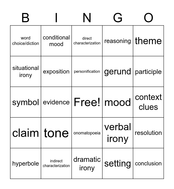 This bingo card has a free space and 39 words: simile, foreshadowing, climax, exposition, hyperbole, onomatopoeia, personification, alliteration, theme, claim, evidence, reasoning, conclusion, context clues, mood, tone, imagery and setting, word choice/diction, connotation, verbal irony, situational irony, dramatic irony, gerund, participle, infinitive, indicative mood, imperative mood, interrogative mood, subjunctive mood, conditional mood, active voice, passive voice, direct characterization, indirect characterization, setting, plot, resolution, symbol and metaphor.