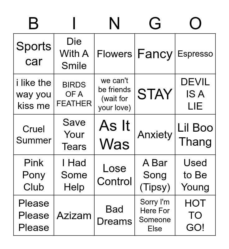 This bingo card has a free space and 34 words: Mystical Magical, Sorry I'm Here For Someone Else, Abracadabra, Am I Wrong, Pink Pony Club, BIRDS OF A FEATHER, Espresso, Please Please Please, Die With A Smile, APT., we can't be friends (wait for your love), Flowers, Too Sweet, Until I Found You, Anxiety, DEVIL IS A LIE, Azizam, Cruel Summer, I Had Some Help, A Bar Song (Tipsy), Lose Control, I Don't Wanna Wait, Sports car, Lil Boo Thang, Bad Dreams, HOT TO GO!, Fancy, Riptide, STAY, i like the way you kiss me, Slow It Down, Save Your Tears, Used to Be Young and Manchild.