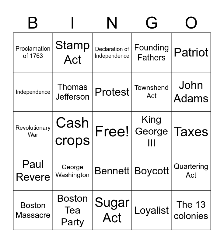 This bingo card has a free space and 24 words: George Washington, Boston Tea Party, Protest, Boston Massacre, Patriot, Proclamation of 1763, Independence, Stamp Act, King George III, Bennett, Townshend Act, Revolutionary War, Boycott, Quartering Act, Thomas Jefferson, Loyalist, Taxes, Declaration of Independence, John Adams, Cash crops, The 13 colonies, Paul Revere, Founding Fathers and Sugar Act.