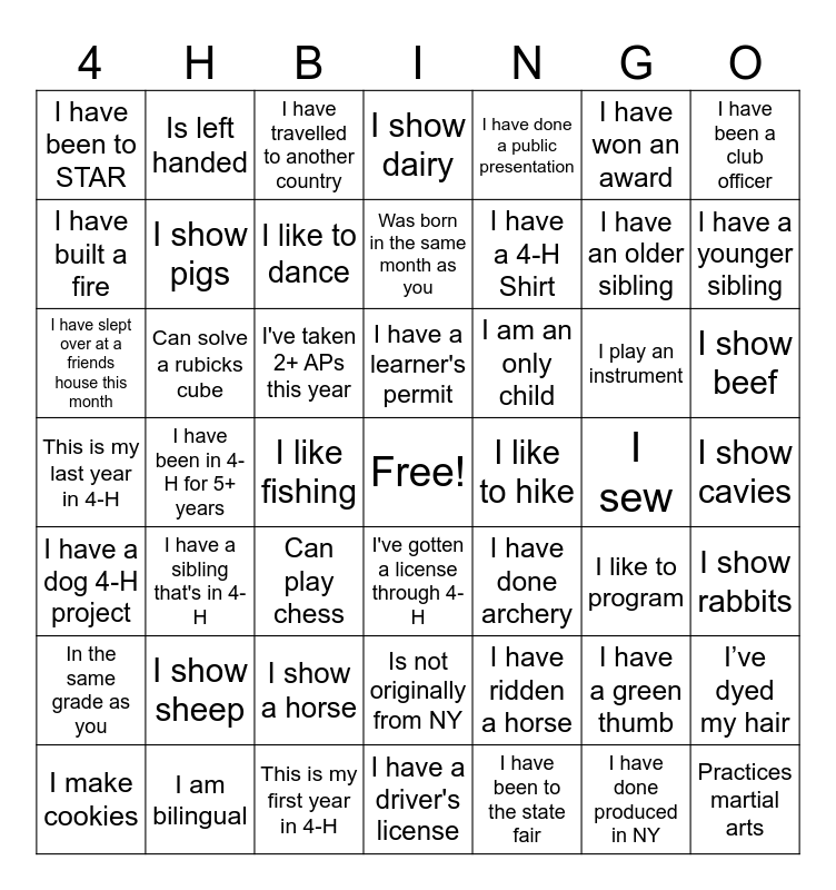 This bingo card has a free space and 55 words: I have been to the state fair, I show beef, I have been to career Ex, I have been to STAR, I have been in 4-H for 5+ years, I show sheep, I have been a club officer, I participated in the Youth Leadership Conference, I show pigs, I show a horse, I show dairy, I show rabbits, I show cavies, I sew, I make cookies, I have a dog 4-H project, I have done a public presentation, I have a 4-H Shirt, I have done produced in NY, I have an older sibling, I have a younger sibling, I have a sibling that's in 4-H, I am an only child, I have travelled to another country, I have broken a bone, I have built a fire, I like fishing, I like learning about the environment, I have slept over at a friends house this month, I play an instrument, I like photography, I like to program, I’ve dyed my hair, I am bilingual, I have won an award, Was born in the same month as you, In the same grade as you, Can solve a rubicks cube, Practices martial arts, Can play chess, Is left handed, Is not originally from NY, I have ridden a horse, I commute by train, I've taken 2+ APs this year, This is my last year in 4-H, This is my first year in 4-H, I have done archery, I like to hike, I like to dance, I've gotten a license through 4-H, I have a green thumb, I have a driver's license, I have a learner's permit and I like to craft.