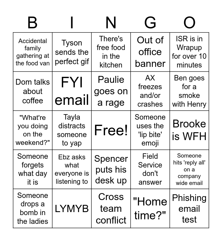 This bingo card has a free space and 24 words: Ebz asks what everyone is listening to, LYMYB, Paulie goes on a rage, Someone drops a bomb in the ladies, ISR is in Wrapup for over 10 minutes, Accidental family gathering at the food van, Dom talks about coffee, Tyson sends the perfect gif, Someone uses the 'lip bite' emoji, Spencer puts his desk up, AX freezes and/or crashes, "What're you doing on the weekend?", Field Service don't answer, Someone hits 'reply all' on a company wide email, FYI email, "Home time?", Brooke is WFH, There's free food in the kitchen, Ben goes for a smoke with Henry, Tayla distracts someone to yap, Phishing email test, Someone forgets what day it is, Out of office banner and Cross team conflict.