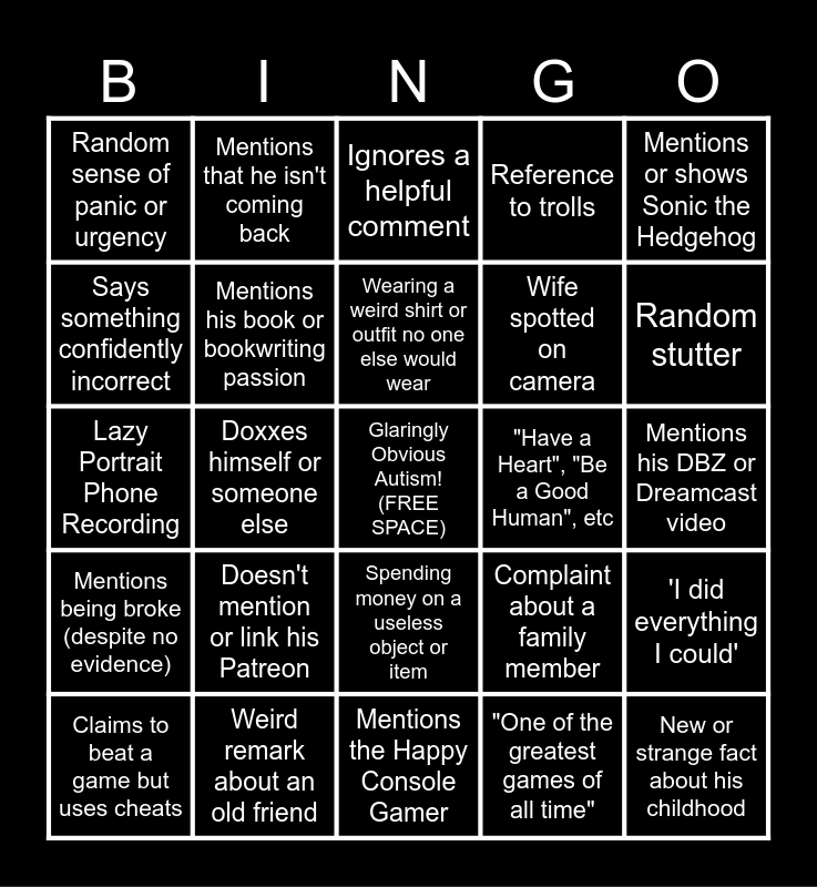 This bingo card has a free space and 24 words: Doesn't mention or link his Patreon, Weird remark about an old friend, Wearing a weird shirt or outfit no one else would wear, Claims to beat a game but uses cheats, Mentions or shows Sonic the Hedgehog, Random sense of panic or urgency, Says something confidently incorrect, Mentions that he isn't coming back, "Have a Heart", "Be a Good Human", etc, Spending money on a useless object or item, Wife spotted on camera, Lazy Portrait Phone Recording, Complaint about a family member, 'I did everything I could', Mentions his book or bookwriting passion, "One of the greatest games of all time", Mentions his DBZ or Dreamcast video, Ignores a helpful comment, Random stutter, Doxxes himself or someone else, New or strange fact about his childhood, Mentions being broke (despite no evidence), Reference to trolls and Mentions the Happy Console Gamer.