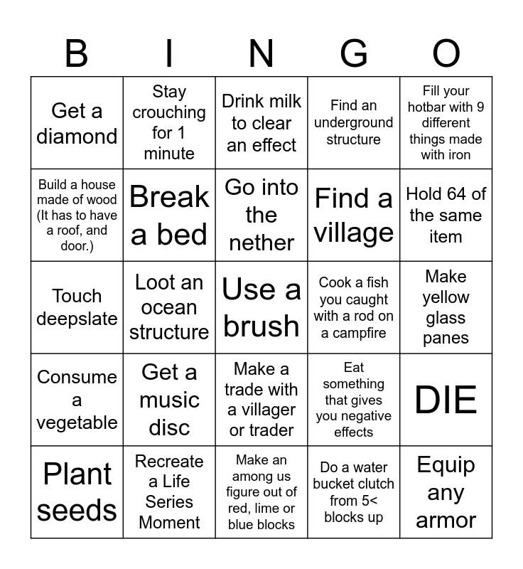 This bingo card has a free space and 24 words: Get a music disc, Recreate a Life Series Moment, Go into the nether, Plant seeds, Fill your hotbar with 9 different things made with iron, Get a diamond, Build a house made of wood (It has to have a roof, and door.), Stay crouching for 1 minute, Cook a fish you caught with a rod on a campfire, Make a trade with a villager or trader, Find a village, Touch deepslate, Eat something that gives you negative effects, DIE, Break a bed, Do a water bucket clutch from 5< blocks up, Make yellow glass panes, Drink milk to clear an effect, Hold 64 of the same item, Loot an ocean structure, Equip any armor, Consume a vegetable, Find an underground structure and Make an among us figure out of red, lime or blue blocks.