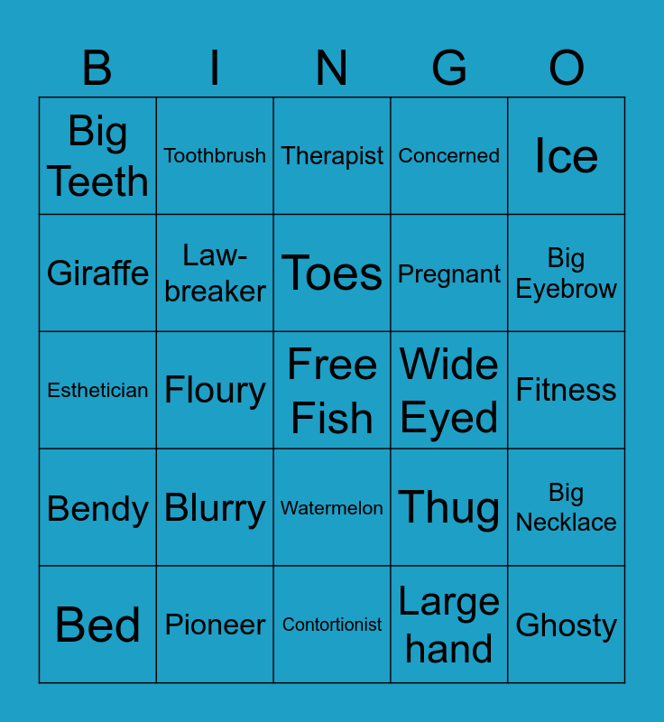 This bingo card has a free space and 24 words: Blurry, Pioneer, Toes, Bed, Ice, Big Teeth, Giraffe, Toothbrush, Wide Eyed, Watermelon, Pregnant, Esthetician, Thug, Big Necklace, Law-breaker, Large hand, Fitness, Therapist, Big Eyebrow, Floury, Ghosty, Bendy, Concerned and Contortionist.