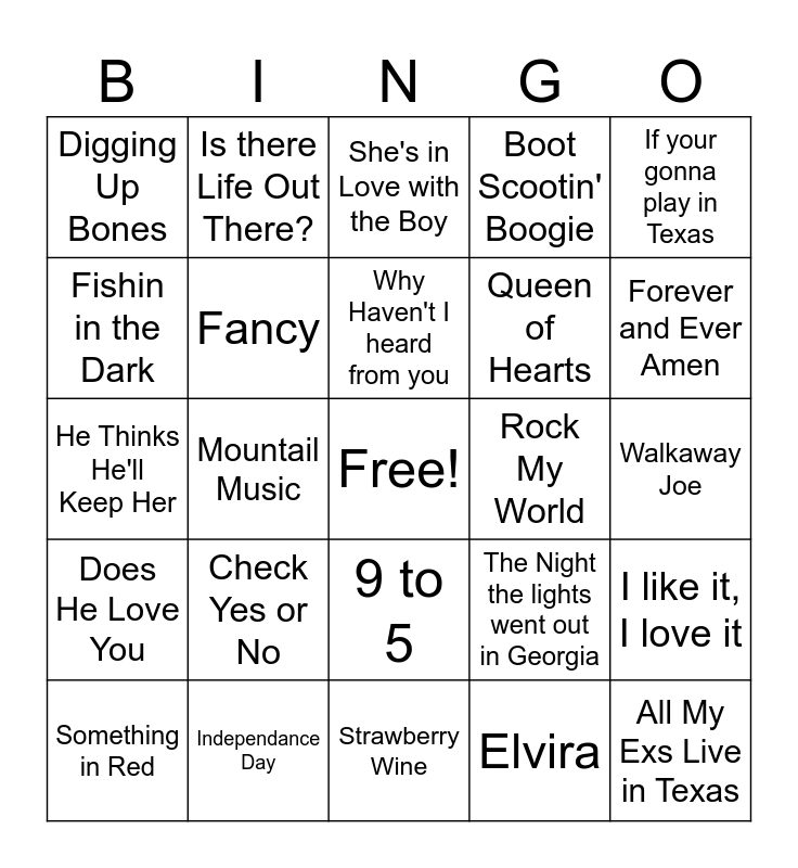 This bingo card has a free space and 36 words: The Dance, Friends in Low Places, Ain't Going Down (till the sun comes up), Fancy, The Night the lights went out in Georgia, Does He Love You, Why Haven't I heard from you, Sold (Grundy County Auction), If your gonna play in Texas, Song of the South, Mountail Music, Boot Scootin' Boogie, Cowgirls Don't Cry, Rock My World, Forever and Ever Amen, Digging Up Bones, I Cross My Heart, Check Yes or No, All My Exs Live in Texas, She's in Love with the Boy, Walkaway Joe, I like it, I love it, Independance Day, Something in Red, Strawberry Wine, Is there Life Out There?, He Thinks He'll Keep Her, Love Can Build a Bridge, Queen of Hearts, Fishin in the Dark, Good Ol' Boys, Bop, Elvira, 9 to 5, Angel of the Morning and Break it to them Gently.