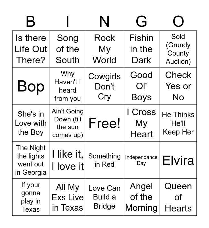This bingo card has a free space and 33 words: The Dance, Friends in Low Places, Ain't Going Down (till the sun comes up), Fancy, The Night the lights went out in Georgia, Why Haven't I heard from you, Sold (Grundy County Auction), If your gonna play in Texas, Song of the South, Boot Scootin' Boogie, Cowgirls Don't Cry, Rock My World, Forever and Ever Amen, Digging Up Bones, I Cross My Heart, Check Yes or No, All My Exs Live in Texas, She's in Love with the Boy, I like it, I love it, Independance Day, Something in Red, Strawberry Wine, Is there Life Out There?, He Thinks He'll Keep Her, Love Can Build a Bridge, Queen of Hearts, Fishin in the Dark, Good Ol' Boys, Bop, Elvira, 9 to 5, Angel of the Morning and Break it to them Gently.
