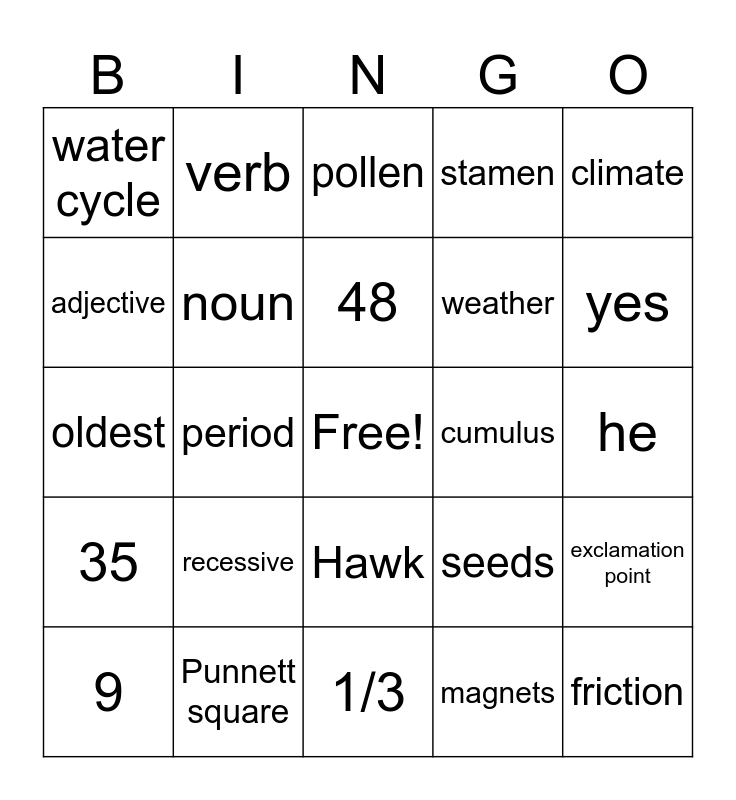 This bingo card has a free space and 34 words: fossil, magnets, Davis, dominant, 35, noun, climate, 9, verb, 1/4, 48, pollen, extinct, she, cumulus, yes, Punnett square, oldest, recessive, seeds, Hawk, petals, water cycle, he, 1/3, friction, stamen, question mark, weather, adjective, swim, period, exclamation point and snow.