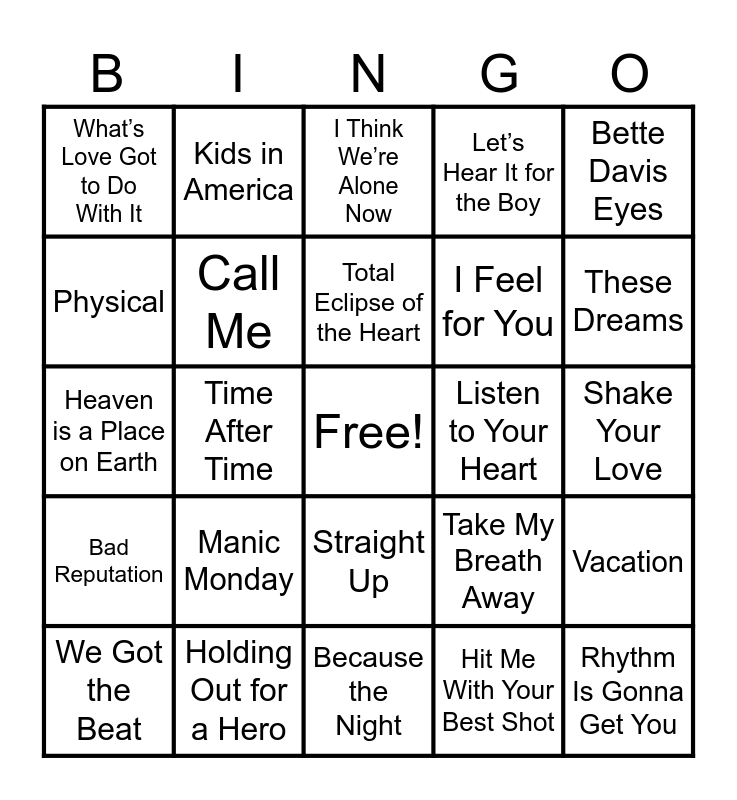 This bingo card has a free space and 42 words: Nasty, Total Eclipse of the Heart, How Will I Know, Manic Monday, Hit Me With Your Best Shot, Vacation, Rhythm Is Gonna Get You, Gloria, I Think We’re Alone Now, Straight Up, Shake Your Love, These Dreams, Time After Time, Bette Davis Eyes, Flashdance…What a Feeling, Take My Breath Away, It’s Raining Men, Heaven is a Place on Earth, Cruel Summer, Kids in America, Physical, Hold On, If I Could Turn Back Time, What’s Love Got to Do With It, I’m Coming Out, 9 to 5, I Feel for You, Wind Beneath My Wings, Vogue, Like a Virgin, Alone, Bad Reputation, Call Me, Because the Night, Stop Dragging’ My Heart Around, We Got the Beat, Holding Out for a Hero, Listen to Your Heart, Shadows of the Night, Walking on Sunshine, Let’s Hear It for the Boy and I’m so Excited.