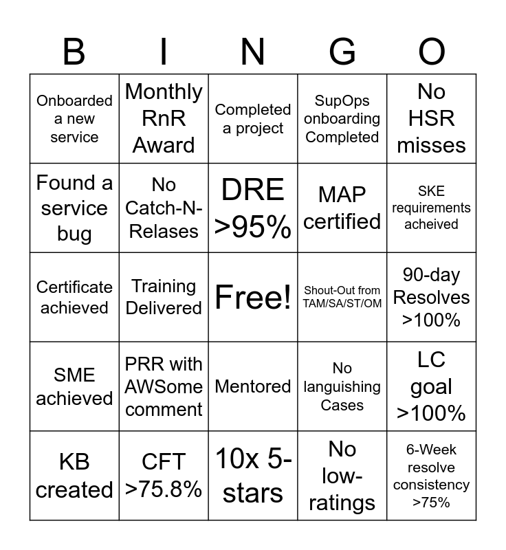 This bingo card has a free space and 24 words: PRR with AWSome comment, CFT >75.8%, DRE >95%, KB created, No HSR misses, Onboarded a new service, Found a service bug, Monthly RnR Award, Shout-Out from TAM/SA/ST/OM, Mentored, MAP certified, Certificate achieved, No languishing Cases, LC goal >100%, No Catch-N-Relases, No low-ratings, 90-day Resolves >100%, Completed a project, SKE requirements acheived, Training Delivered, 6-Week resolve consistency >75%, SME achieved, SupOps onboarding Completed and 10x 5-stars.