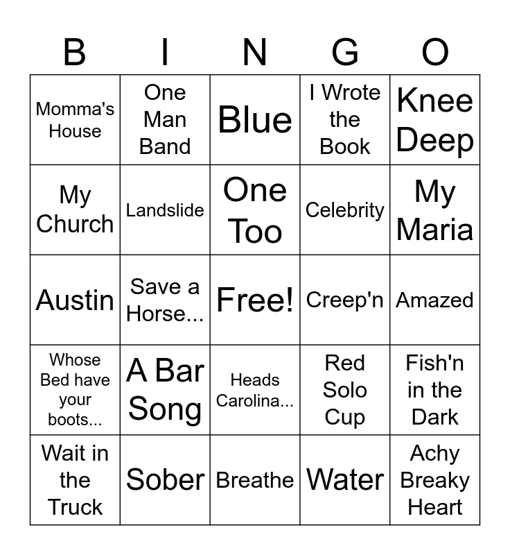 This bingo card has a free space and 24 words: A Bar Song, Sober, One Too, Wait in the Truck, Knee Deep, Momma's House, My Church, One Man Band, Creep'n, Heads Carolina..., Celebrity, Austin, Red Solo Cup, Fish'n in the Dark, Landslide, Water, Amazed, Blue, My Maria, Save a Horse..., Achy Breaky Heart, Whose Bed have your boots..., I Wrote the Book and Breathe.