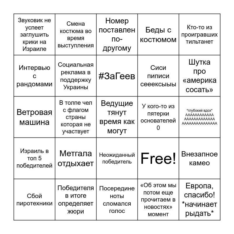 This bingo card has 25 words: Метгала отдыхает, Посередине ноты сломался голос, #ЗаГеев, Сбой пиротехники, Кто-то из проигравших тильтанет, Звуковик не успеет заглушить крики на Израиле, Интервью с рандомами, Смена костюма во время выступления, У кого-то из пятерки основателей 0, Неожиданный победитель, Сиси пиписи сееексыыы, Ветровая машина, Free!, Внезапное камео, Социальная реклама в поддержку Украины, Европа, спасибо! *начинает рыдать*, *глубокий вдох* АААААААААААА ААААААААААААА ААААААААААААААА, Номер поставлен по-другому, Шутка про «америка сосать», В толпе чел с флагом страны которая не участвует, Ведущие тянут время как могут, Победителя в итоге определяет жюри, Израиль в топ 5 победителей, Беды с костюмом and «Об этом мы потом еще прочитаем в новостях» момент.
